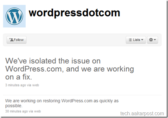 In twitter wordpress says, ‘We are working on restoring WordPress.com as quickly as possible". Its still unknown, why wordpress.com blogs were down but in a twitter wordpress mention, “We've isolated the issue on WordPress.com, and we are working on a fix.”